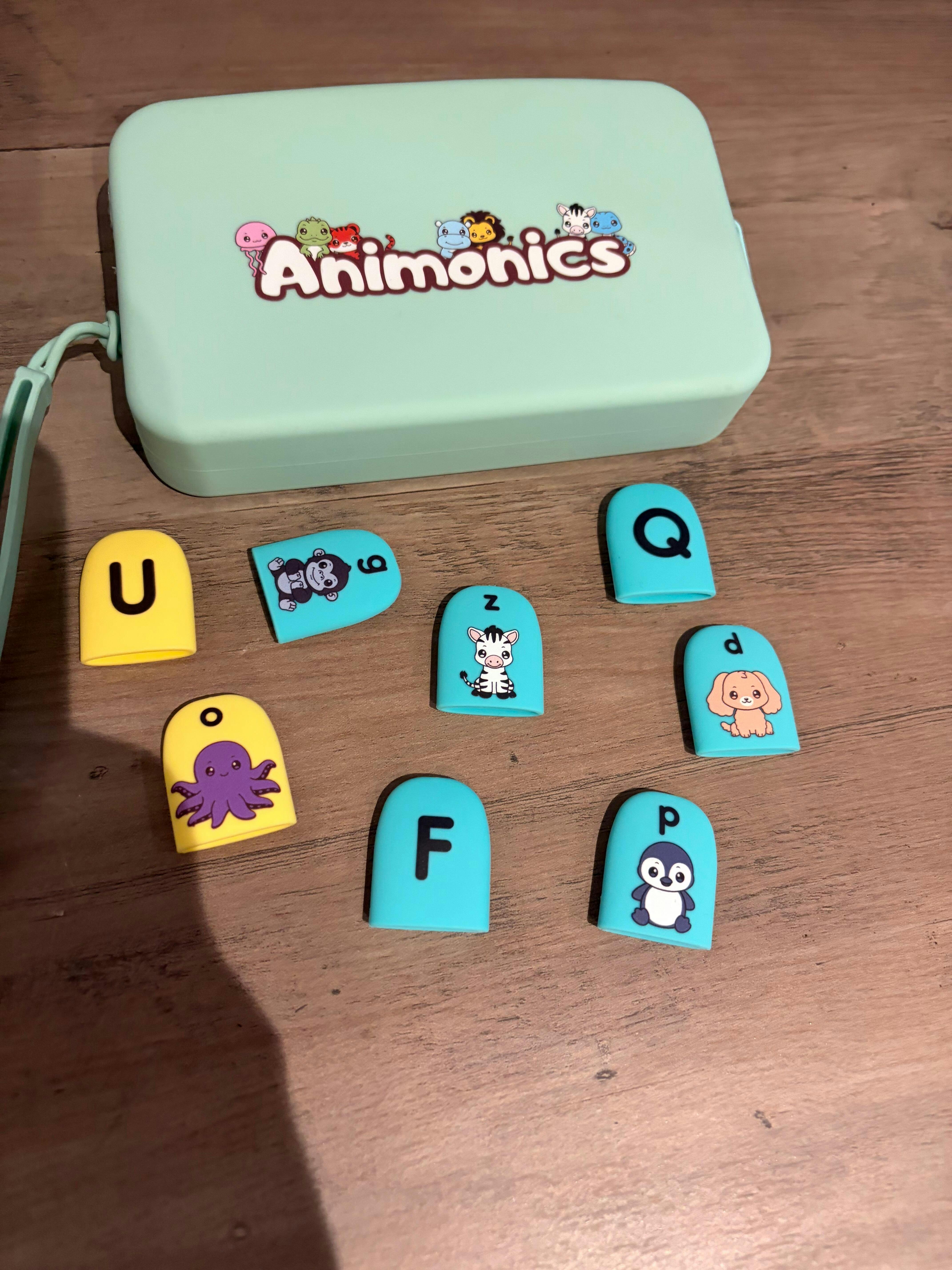 A set of 26 animal-themed alphabet silicone finger caps with a storage case, designed to help children aged 3+ learn key phonics skills, including letter sounds, blending and spelling.